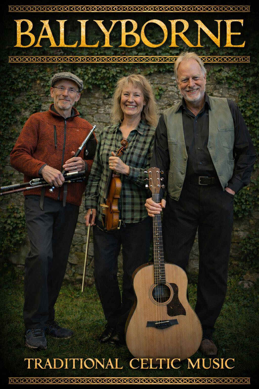 Ballyborne laat je meenemen op een betoverende reis door Ierland, met een mix van opzwepende ritmes en ontroerende melodieën. Deb, geboren in Engeland, speelt de viool met een bijzondere gevoeligheid voor de Ierse muziek. Ze brengt de deunen, met zoveel emotie en energie tot leven dat het publiek zich bijna in het hart van Ierland waant. Of het nu een vrolijke dans of een melancholische melodie is, Deb weet de juiste snaar te raken, Wim bespeelt de authentieke Uilleann Pipes, dat al eeuwen lang borg staat voor het typisch Ierse geluid. Wim’s spel creëert een unieke sfeer die de essentie van de Ierse cultuur weerspiegelt.. Naast de pipes beheerst Wim ook de Ierse Tin Whistles. Geert, beter bekend als Gerry vanwege zijn Ierse afkomst, voegt met zijn warme stem en gitaarbegeleiding de vocale kracht toe aan het trio. Hij zingt niet alleen ballades en subsongs met gevoel, maar begeleidt ook de instrumentale stukken op vurige wijze op zijn gitaar. Of het nu gaat om opzwepende jigs, energieke reels of de meer ingetogen Slow Airs, Geert’s gitaarspel zorgt voor de ritmische drive die de muziek compleet maakt.